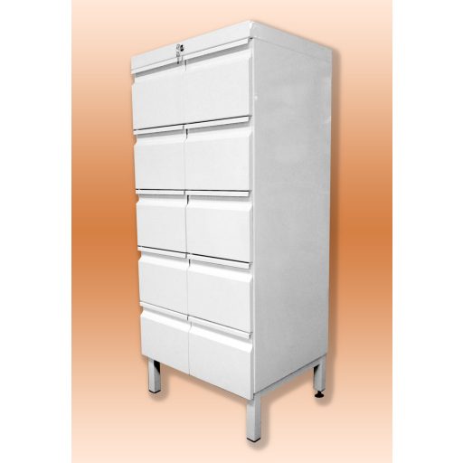 Für einen A5-Umschlag. Der Korpus und die Schubladen des Schranks sind aus Stahlblech mit elektrostatischer Pulverbeschichtung gefertigt. Die Schubladen bewegen sich auf Rollenschienen für eine einfache Bewegung, sie sind mit 1 Zentralschloss mit 2 Sicherheitsschlüsseln verschlossen. Die Beine sind aus Stahlhohlprofil, eines der vier Beine hat einen Nivellierbolzen, um ein Verkanten durch unebenen Boden zu verhindern. Die Grundfarbe der Lackierung ist weiß, in weiteren Farben kann sie gemäß dem RAL-Farbcode bestellt werden.
