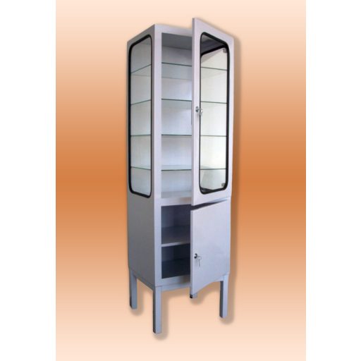 Korpus aus Stahlblech, geschweißte Klöppelbeine. Die Oberfläche ist mit elektrostatischer Pulverbeschichtung lackiert, die Regale bestehen oben aus Glas und unten aus Blech. Die oberen Türen und die oberen Plattentüren mit Glaseinsätzen, die in einem Gummibett befestigt sind, sind mit Sicherheitsschlössern ausgestattet. Die Grundfarbe ist weiß, auf Anfrage auch in anderen Farben erhältlich.