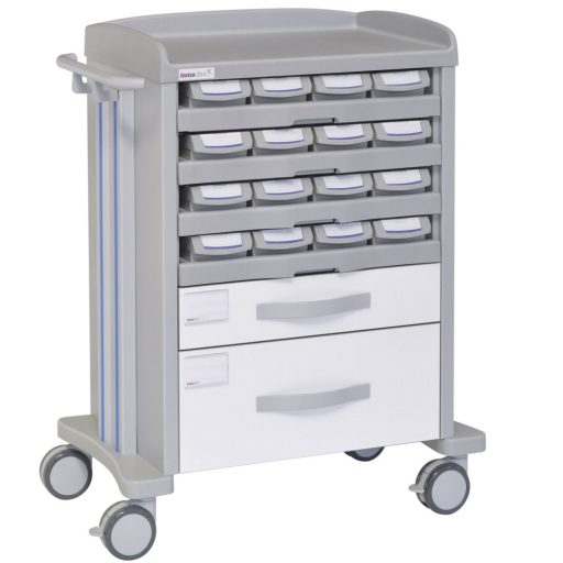 - 4 Einlegeböden mit 16 Apotheken, 230x120x70mm, 110% Vollöffnung