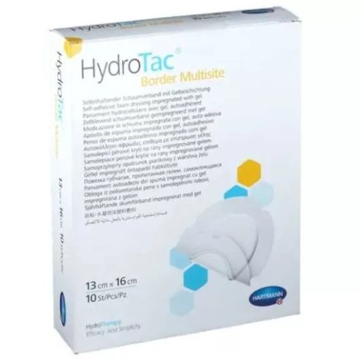 Saugfähiger Schaumverband, der auf der Wundseite mit Gel beschichtet ist, mit einer wasserdichten, atmungsaktiven und bakterienresistenten Deckschicht. Mit Kleberand. Dank Einkerbungen am Saum schmiegt sie sich besonders gut an die Konturen des Körpers an. Das Hydrogel mit Netzstruktur ist in der Lage, Feuchtigkeit abzugeben und zu verhindern, dass der Verband an der Wunde klebt, und bietet einen atraumatischen Verbandswechsel. Der Verband kann auch für die Kompressionstherapie verwendet werden. Zur Behandlung von mäßig und leicht exsudierenden Wunden in der Granulations- und Epithelisierungsphase, zur Förderung der Epithelisierung, zur Behandlung akuter und chronischer Wunden, zur Wundversorgung nach Operationen. Steril, einzeln verpackt.