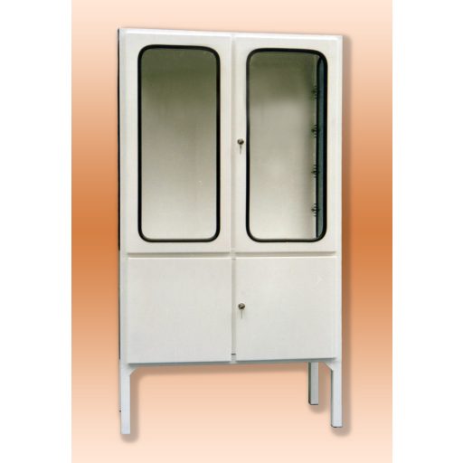 Korpus aus Stahlblech, geschweißte Klöppelbeine. Die Oberfläche ist mit elektrostatischer Pulverbeschichtung lackiert, die Regale bestehen oben aus Glas und unten aus Blech. Die oberen Türen und die oberen Plattentüren mit Glaseinsätzen, die in einem Gummibett befestigt sind, sind mit Sicherheitsschlössern ausgestattet. Die Grundfarbe ist weiß, auf Anfrage auch in anderen Farben erhältlich.