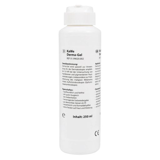 Das Derma-Gel von KaWe hilft bei dermatologischen Untersuchungen mit den Dermatoskopen Eurolight D 30, D 30 LED und Piccolight D. Es beugt Hautreflexen vor und macht die Hautstruktur unsichtbar, so dass Hautverfärbungen besser und gründlicher betrachtet werden können. Verwenden Sie es bei Erwachsenen, Ki