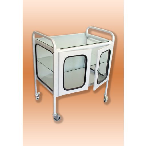 Schrankkorpus aus Stahlblech, gebogene Klemme an den Beinen. Die Oberfläche ist mit elektrostatischer Pulverbeschichtung lackiert und das Dach besteht aus Glas. Bewegt wird er mit Hilfe von 4 Rädern, von denen 2 gebremst werden können. Die Glastür ist in einem Gummibett befestigt und verfügt über ein Sicherheitsschloss. Die Grundfarbe ist weiß, auf Anfrage auch in anderen Farben erhältlich.