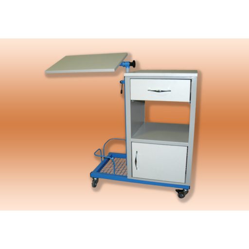 Die Bewegung wird von vier selbstnivellierenden Rollen mit einem Durchmesser von 50 mm unterstützt, von denen 2 gebremst und auf die Räder geschlagen werden können. Die Grundfarbe des Metallrahmens ist weiß, oder es können auch andere Farben gemäß den RAL-Farbcodes ausgewählt werden. Das Foto zeigt den Typ der schwenkbaren Tischplatte.