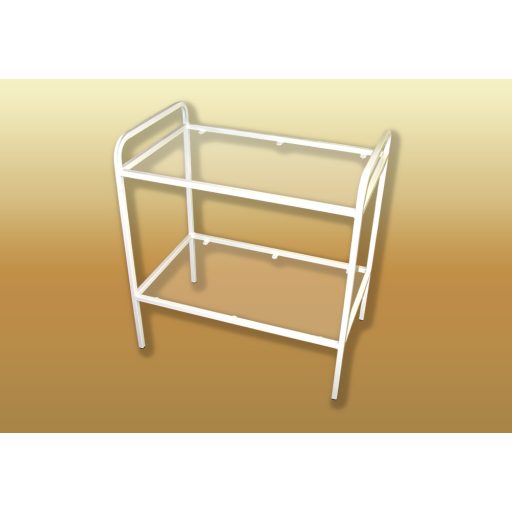 Gebogene, geschweißte Stahlrahmenkonstruktion, die mit elektrostatischer Pulverbeschichtung lackiert ist. Die Regale bestehen aus Glasplatten. Seine Rahmenstruktur ist fest, aber es wird auch in einer Rollenversion hergestellt. Seine Grundfarbe ist weiß, es kann auf Wunsch auch in anderen Farben hergestellt werden.