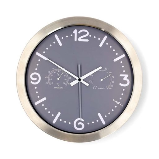 Nedis CLWA5226SS falióra, 30 cm átmérő, rozsdamentes acél, csendes szerkezet: óra, hőmérő, páratartamom mérő