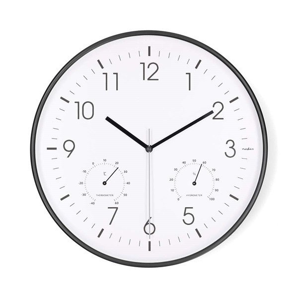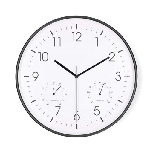 Nedis CLWA4226BK falióra, 30 cm átmérő, műanyag, csendes szerkezet: óra, hőmérő, páratartamom mérő