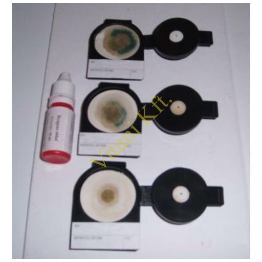 The FECA test detects the haemoglobin content of faecal blood on a guaiacol-impregnated filter paper based on a cumene-peroxide colour reaction. Identification from a sample with a positive colour reaction can be performed by the human-specific immunochemical method using the enclosed FOB test.
