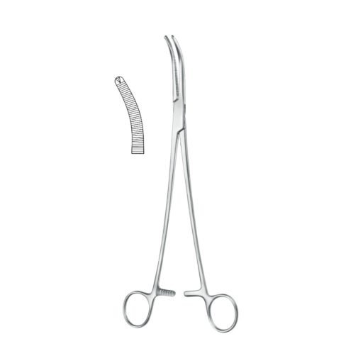 The Wertheim-type hysterotomy forceps are a special gynaecological and obstetric instrument used for operations to remove uterine ligaments and blood vessels. The appropriately shaped instrument allows atraumatic removal of the uterus from the pelvic cavity. The long, curved parts allow adaptation to the anatomy of the cavity. The working pieces have special grooves for the best possible grip and are available in two versions - classic and 1/2 serrated end. The handle of the instrument is equipped with a stepless lock allowing the pressure force to be adjusted as required.