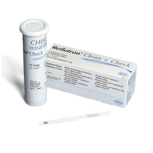 With Reflotron® Clean + Check, the Reflotron® blood analyser can be easily cleaned and tested. The Clean + Check set contains 16 cleaning wipes and 15 test strips. The individually-packed cleaning wipes are used for cleaning the measuring system according to the instructions provided. The cleaning should be done when the Reflotron® is displaying the message "Measure Clean and Check". This occurs after 7 days or 100 measurements. After cleaning, the Reflotron® blood analyser is turned back on and the Clean + Check test strip inserted.