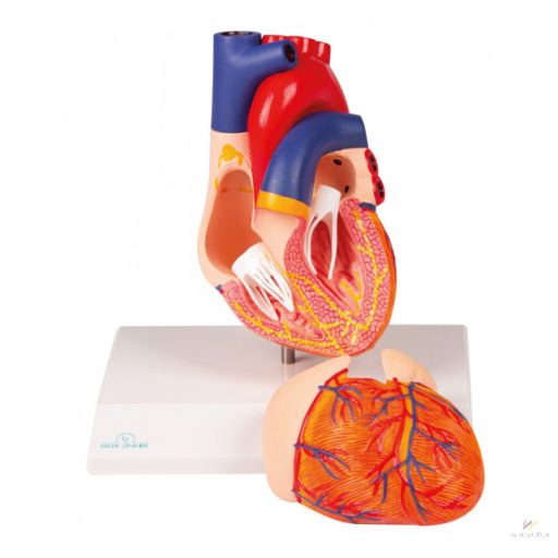 The front wall of the heart can be removed to show the internal structures in detail. All important structures are present, such as the ventricles, atria, aortic, mitral, pulmonary and tricuspid valves. The myocardium, adipose tissue, arteries and veins are shown in detail, with the conduction system highlighted in colour. The model is made of unbreakable plastic and is removable from the stand.