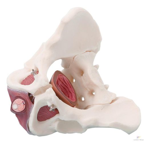 This pool is an excellent way to explain the male pelvic floor. The model consists of 2 iliac bones, the sacrum, the coccyx and the pelvic floor. The pelvic floor is made of flexible synthetic material on which the structures are painted. The model is identical to model 4070, but in a male version. It has a removable bladder, prostate and seminal vesicle. The muscle layers are in two parts. The model is life-size.