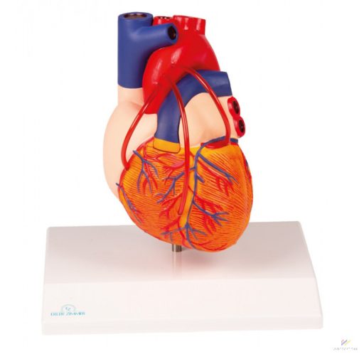 This life-size, two-piece model illustrates in great detail the anatomy of the human heart with three coronary artery bypasses. The front wall can be detached to reveal the inner chamber and valves. Mounted on a stand.