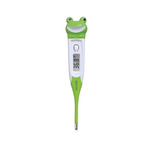 An audible alarm indicates when the device is ready for use and when the measurement is complete. The thermometer stores the last measurement result.