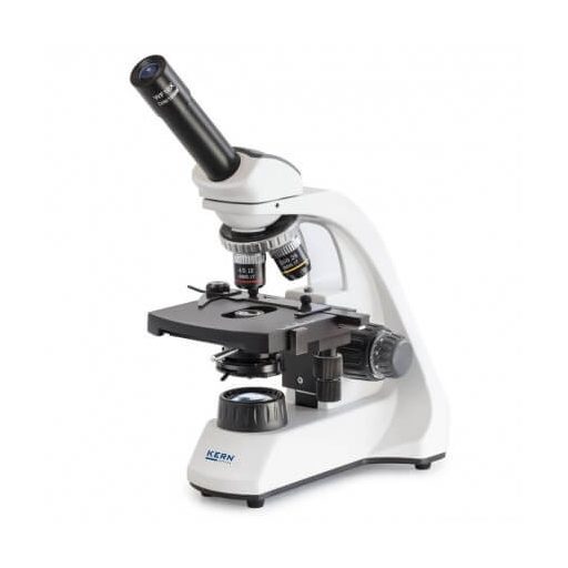 The OBT 103 transmitted light microscope from KERN is a school microscope characterized by clear controls and robustness. It is suitable for thin, high-contrast, less demanding preparations, such as translucent plant tissue, stained cells and parasites. The monocular tube for single-eye viewing is fully rotatable and tilted to 45°. The power supply is via cable or battery operation, so that the OBT 103 can also be used as a mobile instrument.