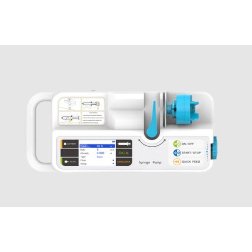 - Alarms for infusion pipe occlusion, syringe fall-off, communication abnormal, low battery.