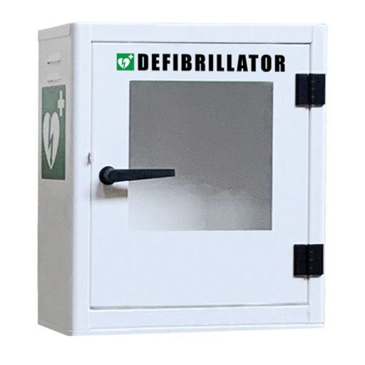 - Szafy z zaokrąglonymi krawędziami, drzwiami na zawiasach z klamką, akcesorium do plastikowej lub metalowej uszczelki i naklejką identyfikacyjną AED.